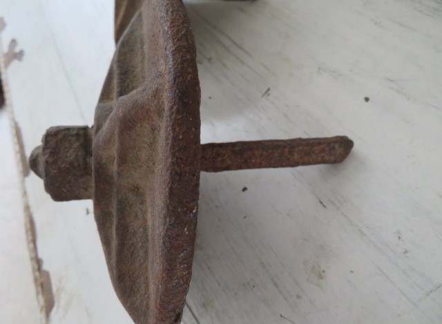 THESE ARE TWO FABULOUS OLD SALVAGED CAST IRON METAL ARCHITECTURAL BUILDING STARS WITH THE STAKE AND A PERFECT TIME WORN RUSTY PATINA.