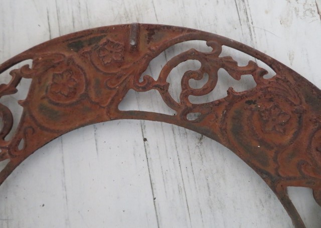 THIS IS THE SALVAGED OUTSIDE RING FROM A DRAIN COVER WITH AN ORNATE DESIGN AND RUSTY PATINA THAT YOU CAN HANG OR SIT AND USE AS A DISPLAY PLATEAU RING, AS I SHOW.