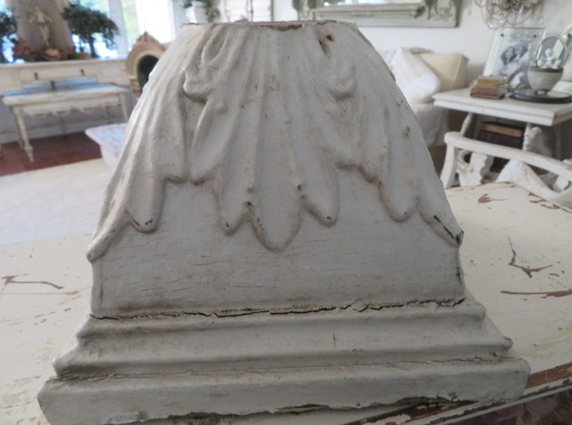 This is a wood salvaged column capital top with such a great look. It has the old white paint that is chippy, with paint loss, minor dirt, and wear.