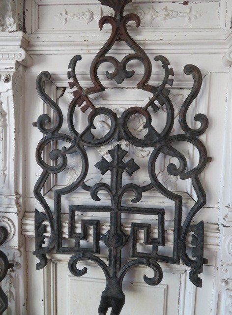 The details are fabulous. These have the absolute best designs and are so ornate and details. These are antique roof crest panels that bordered the rooftops. The black paint is nicely weathered, chippy, with a little rust and worn for an awesome look. There are a few minor soldered repairs on the backs.
