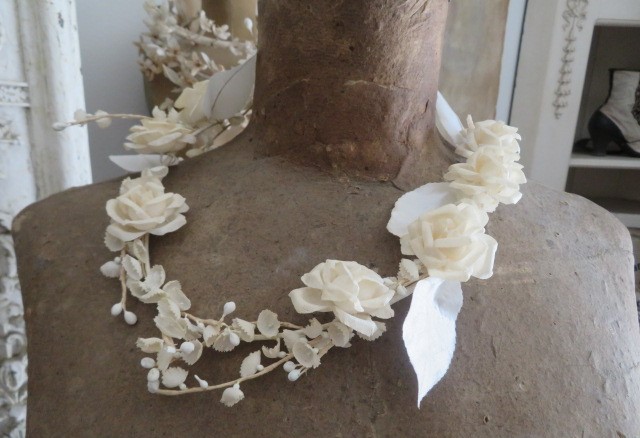 THIS IS A GORGEOUS OLD VINTAGE FRENCH BRIDAL ARCH, PERHAPS FROM A CAKE TOPPER, OR AN ARCH CROWN, WITH 8 CREAMY WHITE ROSES AND LILIES OF THE VALLEY FLOWERS..