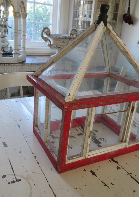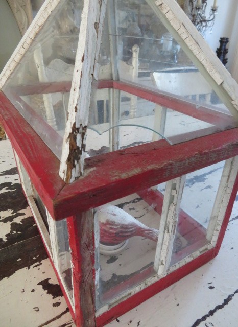 THIS IS AN OLD VINTAGE WOOD AND GLASS TERRARIUM OR GREENHOUSE WITH THE ORIGINAL WHITE AND RED PAINT AND A BLACK FINIAL AT THE TOP.
