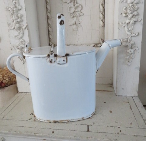 THIS IS A FABULOUS OLD VINTAGE FRENCH WHITE ENAMEL WATERING CAN, WATER CAN OR HOT WATER JUG WITH A HINGED LID IN A SMALLER RARE SIZE.