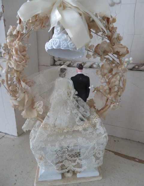 This is one of the most beautiful toppers I have seen in a while. There are 4 square columns holding up the pedestal that the bride and groom are standing on. The rose and flower covered arch has two ornate large bells. Her lace wedding dress has some minor stains. There is minor discoloration, yellowing and wear. The bottom says, Mom and Dad's wedding cake topper 8/1956