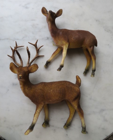 This is the cutest pair! The larger one has plastic antlers. There is minor paint loss, worn or loss of flocking, fading, minor dirt and wear.