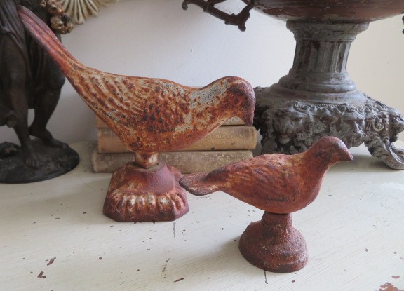 THIS ARE TWO FABULOUS OLD VINTAGE CAST IRON METAL GARDEN BIRD STATUSE ON BASES THAT ARE WHIT AND RUSTY WITH A GREAT RUSTY PATINA.
