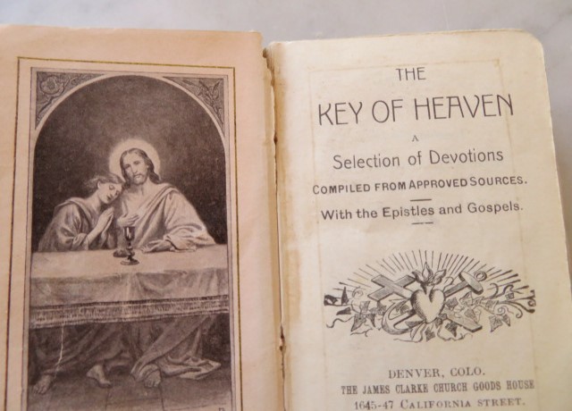 The New Testament has handwritten names and dated 1941 on the first pages, as I show. The Key of Heaven is separated from the spine and has a few loose pages. That one has a date of 1899. There are stains, dirt, yellowing to the pages and wear to both.