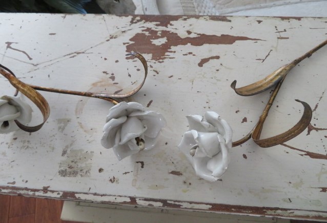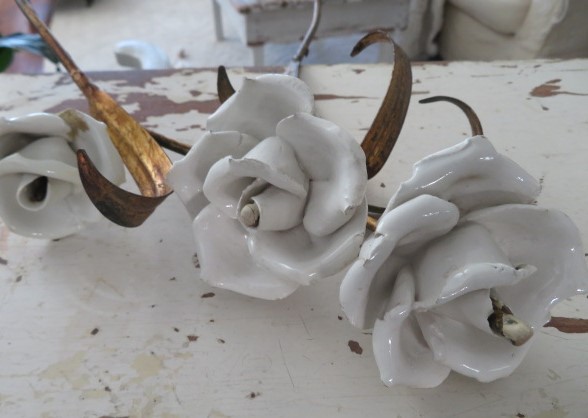 THIS IS 3 LARGE GORGEOUS OLD ANTIQUE CERAMIC PORCELAIN WHITE ROSES WITH GOLD METAL TOLE LEAVES THAT IS BREATHTAKING! These are three roses on two stems with leaves. There are some minor chips, minor dirt and wear to the roses. The stems were cut at the bottom. Measurements are about 2" to 2 3/4" just for the roses. With the stems they are about 13" long.