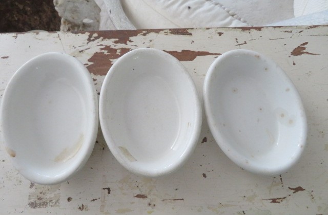 THESE ARE THREE OLD VINTAGE WHITE IRONSTONE SMALL THICK OVAL BOWLS OR PLATTERS WITH STAINS AND CRAZING