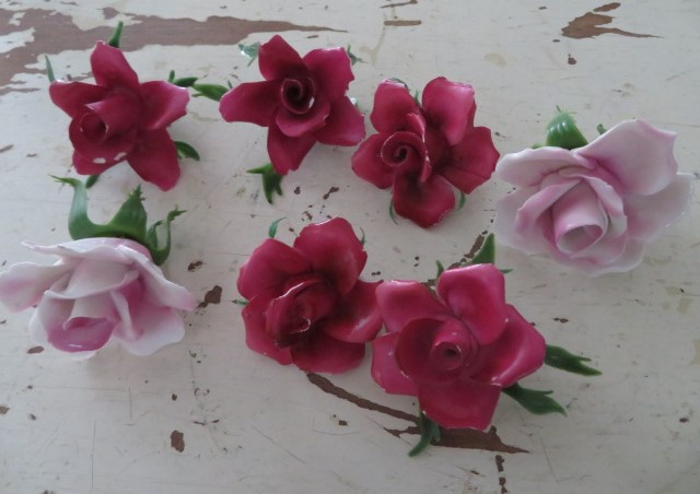 THESE ARE SEVEN GORGEOUS OLD VINTAGE CERAMIC OR PORCELAIN PINK AND CRANBERRY ROSES.