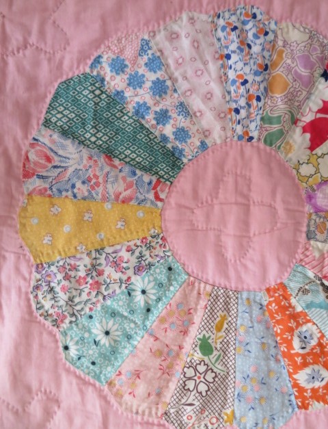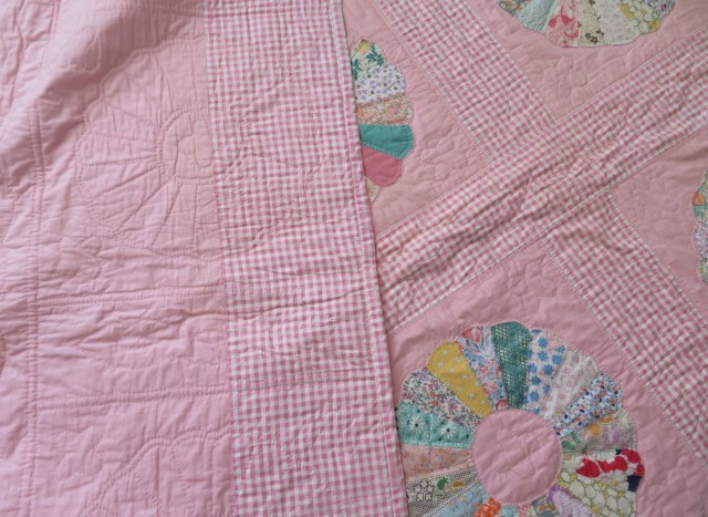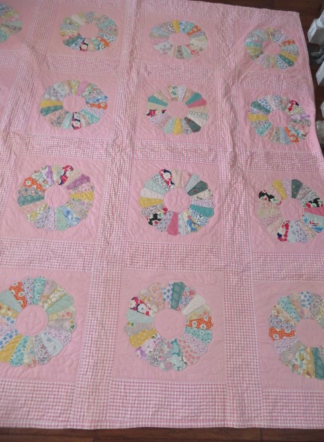 THIS IS A BEAUTIFUL OLD VINTAGE QUILT THAT IS MADE IN THE POPULAR PATTERN, DRESDEN PLATE USING PINK AND WHITE GINGHAM AND MULTI COLORS FOR THE DRESDEN PLATES THAT IS HAND STITCHED .