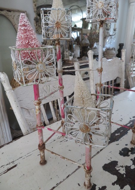 It is metal with the old white and pink paint, that has paint loss, some rest, chippy paint, minor dirt and stains and wear. It is free standing and can be adjusted to open almost straight, or in different ways, as I show.