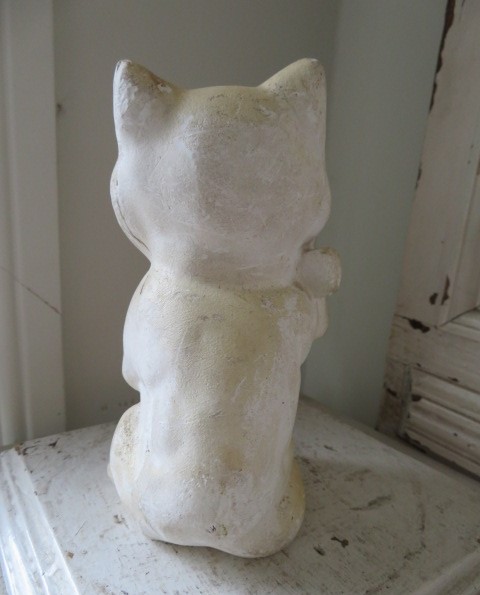 THIS IS A SMALL VINTAGE CHALKWARE CREAMY WHITE CAT OR KITTEN FIGURINE STATUE WITH A BOW AND BIG EYES.