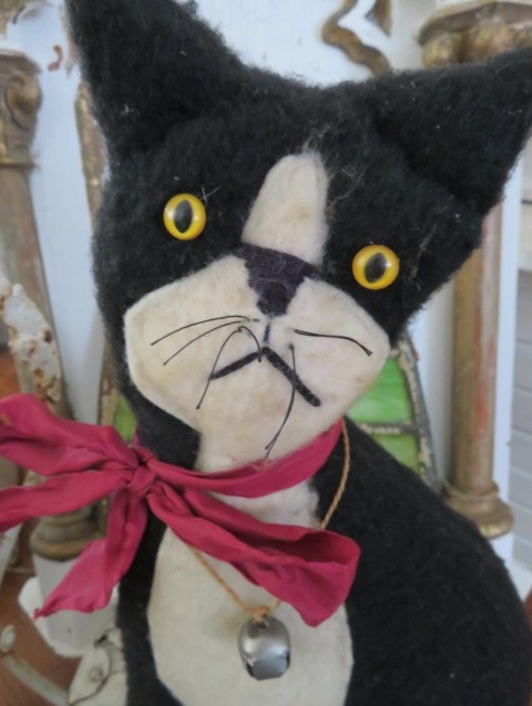 THIS IS A VINTAGE FREE STANDING BLACK AND WHITE TUXEDO SITTING CAT THAT IS FABRIC AND STUFFED WEARING A BOW AND BELL AROUND HIS NECK.