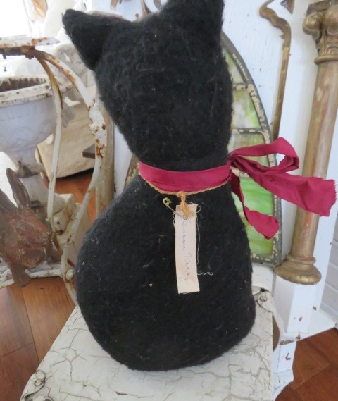 His whiskers are a little crooked. The fabric body has some pilling, minor stains and wear. On the back is a pinned label that is signed what looks like Susan Terry.