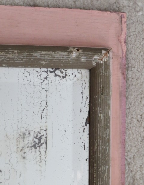 This could easily be a keeper! This was probably off the door on an old medicine cabinet. The back is thin wood with the old pink paint that is chippy with paint loss and wear. It has a gold wood molding around the mirror. The mirror itself is beveled and has streaking, silver loss, some spots and wear. There is no hanger on the back.