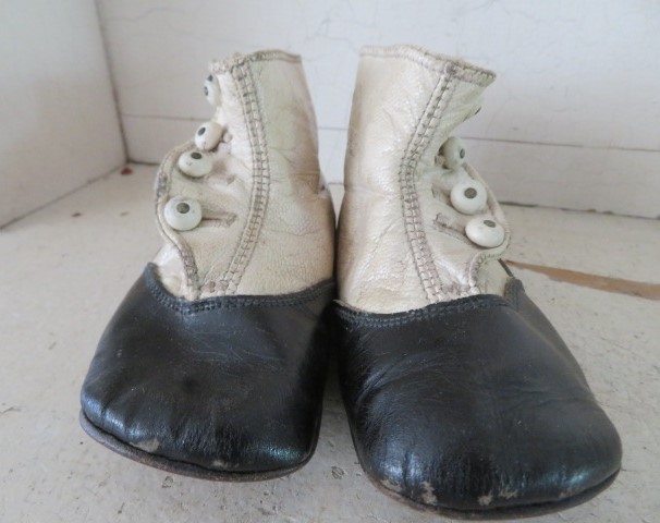 THIS IS A PAIR OF ANTIQUE BABY OR CHILDREN'S LEATHER HIGH TOP SHOES OR BOOTS IN BLACK AND CREAM WITH CLASSI BUTTON UP CLOSURE WITH SMALL BUTTONS ALONG THE SIDE.