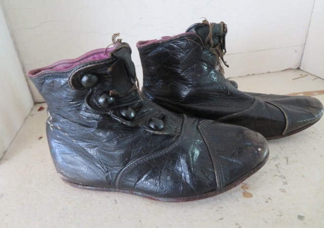 THIS IS A PAIR OF VICTORIAN ANTIQUE BABY OR CHILDREN'S LEATHER HIGH TOP SHOES OR BOOTS IN BLACK WITH BOWS AT THE TOP AND WITH CLASSIC BUTTON UP CLOSURE WITH SMALL BUTTONS ALONG THE SIDE.