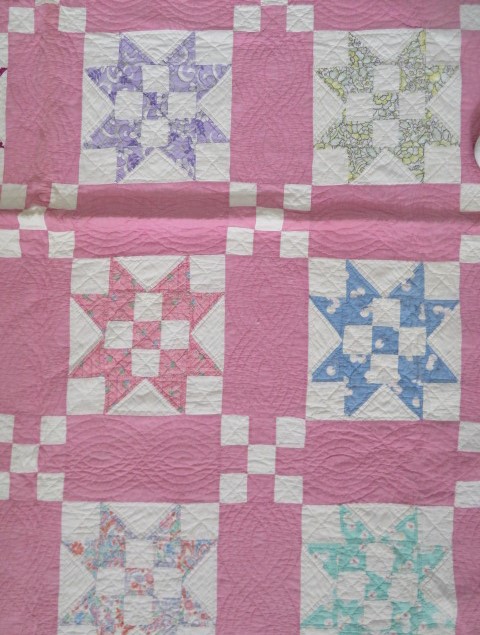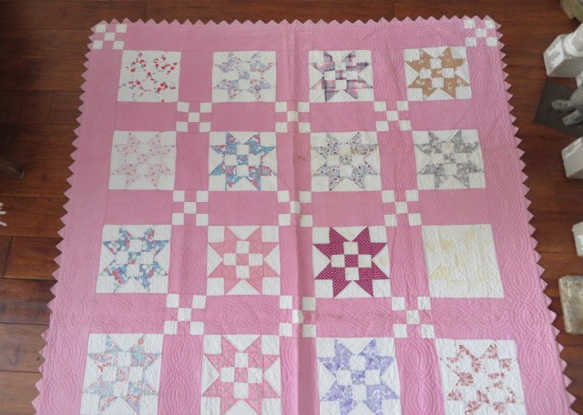 THIS IS A BEAUTIFUL OLD ANTIQUE QUILT IN A STAR BLOCK PATTERN AND WITH A PINK ZIG ZAG OR SCALLOPED BORDER THAT IS HAND STITCHED.