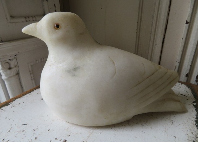 THIS IS A BEAUTIFUL OLD VINTAGE WHITE ALABASTER OR MARBLE BIRD, OF LOVE MOURNING DOVE STATUE WITH GLASS EYES.