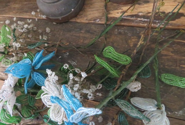 THESE ARE 15 STEMS WITH OLD VINTAGE BEADED FLOWERS AND LEAVES IN WHITE, BLUE AND GREEN.