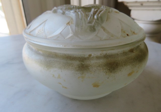 THIS IS A CHARMING VINTAGE FROSTED GLASS LIDDED POWDER JAR OR TRINKET JAR WITH TWO LOVEBIRDS ON THE LID.