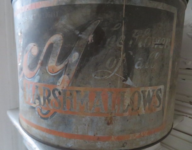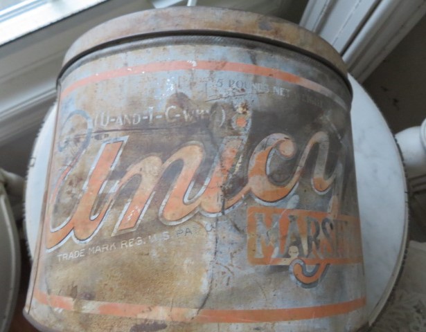 THIS IS AN OLDER EMPTY ADVERTISING MARSHMALLOWS TIN FOR UNICY MARSHMALLOWS, A BRAND BY BRANDLE & CO, OF PHILADELPHIA, PENNSYLVANIA THAT IS FADED AND WELL WORN WITH SUCH A GREAT LOOK.