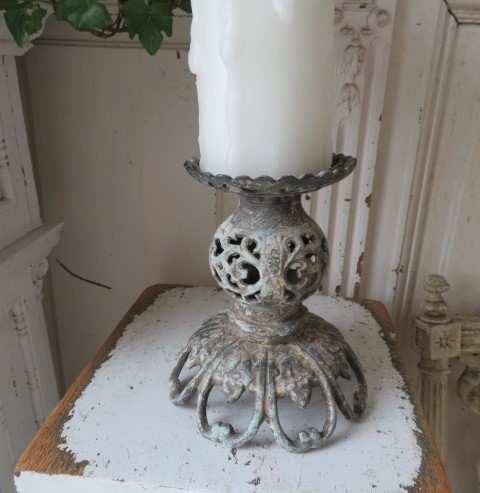 THIS IS A FABULOUS OLD VINTAGE CAST IRON METAL ORNATE AND DETAILED CANDLE HOLDER STAND OR PEDESTAL WITH AN AWESOME PATINA