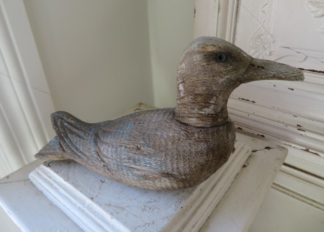 THIS IS AN OLD VINTAGE HAND CARVED WOOD SITTING BIRD OR SCULTURE, THAT LOOKS LIKE A SEAGULL WITH METAL EYES.