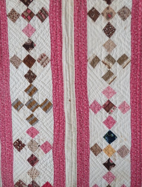 THIS IS A GORGEOUS OLD ANTIQUE QUILT WITH TINY POSTAGE STAMP PIECES IN A PATCHWORK AND STRIPED PATTERN, WITH PINK, WHITE AND BROWN PRINTS.