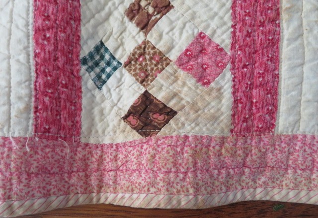 This is an older quilt that is well made and of good quality. There is hand stitching and machine stitching. I show a couple pictures with a dime to show you the size of the smallest pieces, which are about 3/4". There are a few stains, as I show, some fading, and wear.