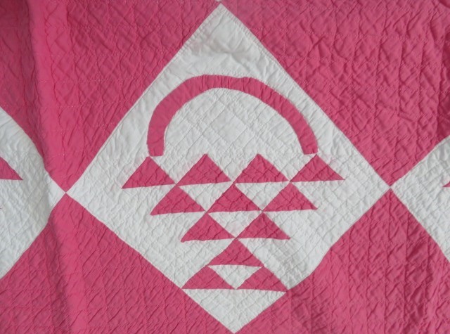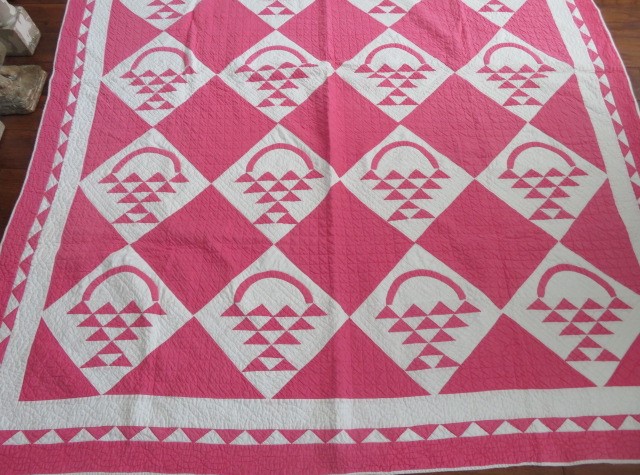 THIS IS A BEAUTIFUL OLD VINTAGE QUILT THAT IS MADE IN THE POPULAR COLORS OF PINK AND WHITE THAT IS HAND STITCHED IN WHAT LOOKS LIKE THE BASKET PATTERN.