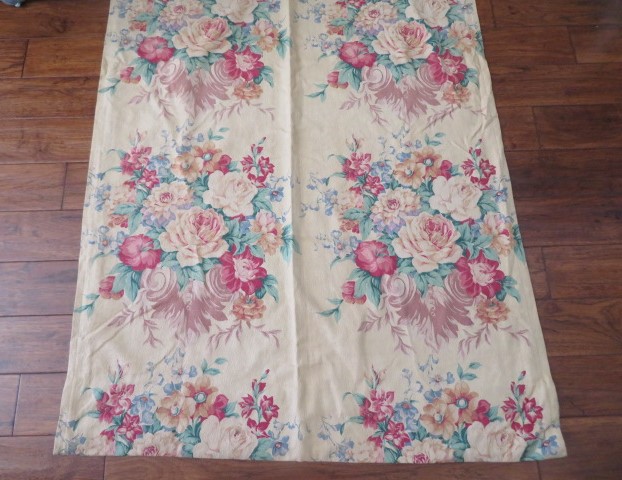 THIS IS A BEAUTIFUL OLD VINTAGE SINGLE BARKCLOTH DRAPERY PANEL OR DRAPE THAT IS A TAN BACKGROUND WITH PINK AND WHITE ROSES AND FLOWERS.
