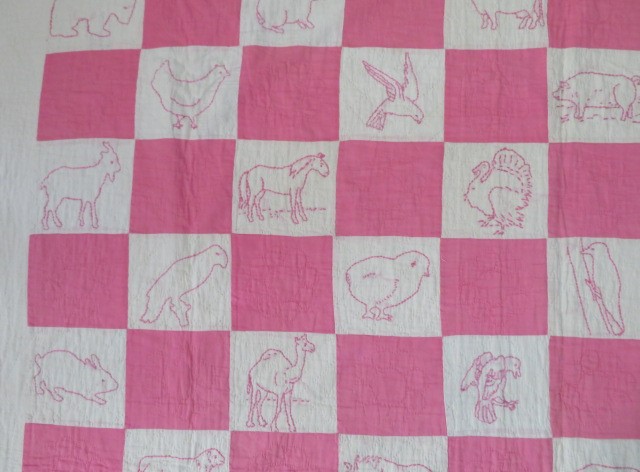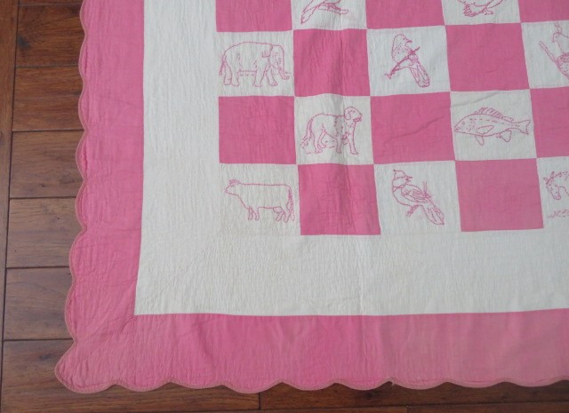 THIS IS A GORGEOUS OLD ANTIQUE HAND STITCHED QUILT IN THE VERY POPULAR SOLID PINK AND WHITE COLORS WITH PINK EMBROIDERED ANIMALS AND SCALLOPED BORDER.