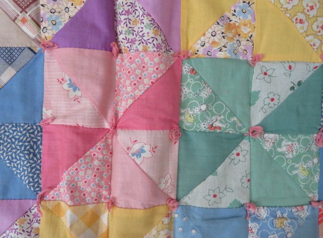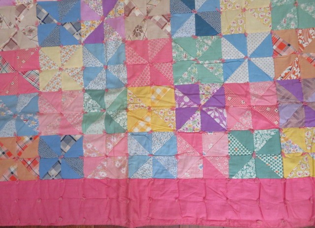 This is a medium weight quilt that is hand tied. It has a pink border and background. There are a few minor age related stains and light wear.