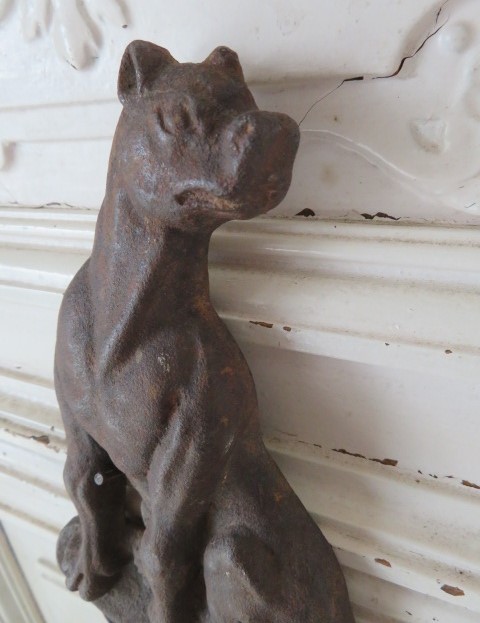 THIS IS A FABULOUS OLD VINTAGE CAST IRON METAL FRONT ONLY FROM A FIREPLACE ANDIRON OR FIRE DOG WITH A DOG RESTING ON A DECORATIVE PEDESTAL