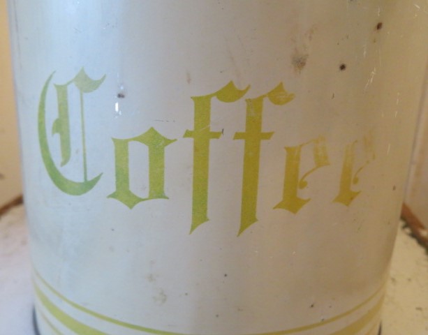 THIS IS AN EMPTY COFFEE TIN OR CANISTER THAT IS METAL WITH A REMOVABLE LID IN CREAMY WHITE WITH GOLD WITH A HINT OF GREETN DETAILS THAT GOES SO WELL WITH YOUR IRONSTONE COLLECTION.