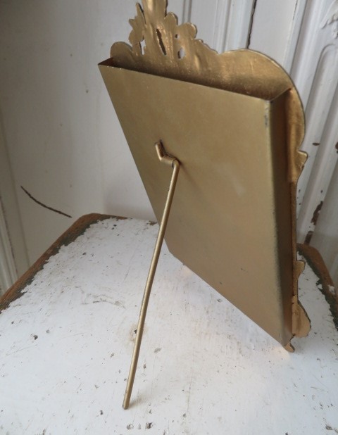 THIS IS AN OLD VINTAGE VERY ORNATE METAL PICTURE FRAME THAT IS FOOTED AND FREE STANDING.