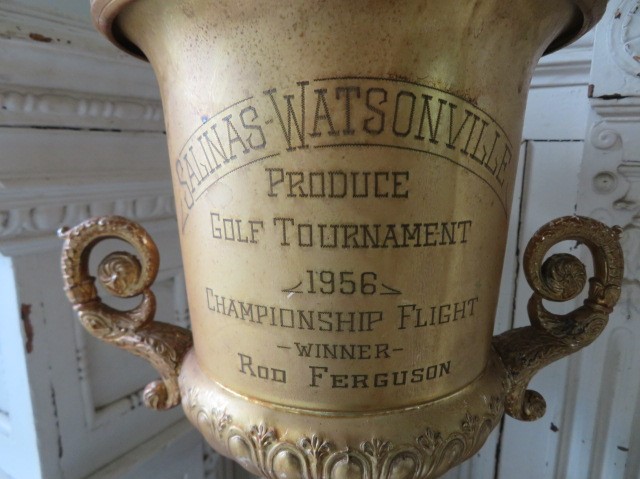 THIS IS AN AMAZING FIND! IT IS A WONDERFUL OLD VINTAGE TROPHY LOVING CUP THAT IS DATED 1956 THAT SAYS "SALINAS WATSONVILLE PRODUCE GOLF TOURNAMENT, 1956 CHAMPIONSHIP FLIGHT WINNER, RON FERGUSON