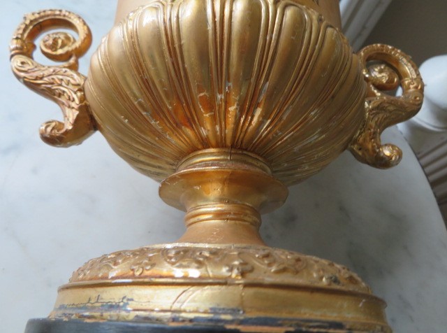 This is a large trophy of about 20" tall to the top of the golf club. It is a lidded two handled cup trophy. It has a golfer figurine on the lid with his golf club and scroll handles. It has a gold colored finish on a dark wooden base. There is discoloration, paint loss, stains, some scratches, tarnish and wear.