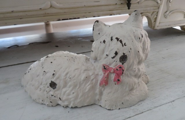THIS IS AN OLD ANTIQUE METAL CAST IRON HUBLEY DOOR STOP THAT IS A WHITE CAT OR KITTEN LYING DOWN THAT IS WEARING A PINK BOW.