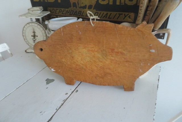 THIS IS AN AWESOME OLD VINTAGE BREAD BOARD OR CUTTING BOARD IN THE SHAPE OF A PIG THAT IS WHITE WITH CRACKLING PAINT.