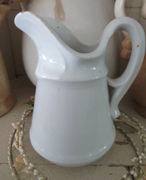 THIS IS AN OLD VINTAGE WHITE IRONSTONE CHUNKY PITCHER OR CREAMER WITH A UNIQUE HANDLE AND SHAPE.