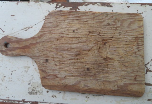 THIS IS AN OLD VINTAGE WOOD BREAD BOARD OR CUTTING BOARD THAT IS WELL WORN WITH A HANDLE
