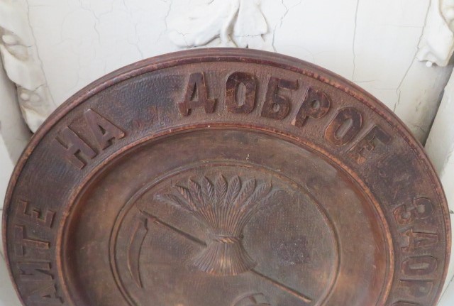 THIS IS ONE OF THE BEST OLD ANTIQUE BREAD BOARD BREAD PLATES I HAVE SEEN IN A LONG TIME. IT IS A RUSSIAN PIECE WITH CARVING AND EMBOSSED TEXT AND WORDS, AND FARMING TOOLS INCLUDING A SHEAF OF WHEAT AND SCYTHE THAT SYMBOLIZES BLESSING OF DAILY SUSTENANCE AND HOSPITALITY.