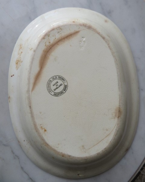 There are stains and wear. I love the fluted design on the inside. The crack is the best and stained with such charm. The bottom is stamped Ridgeways Old Ivory Bedfordware England.