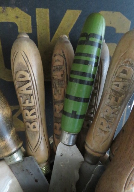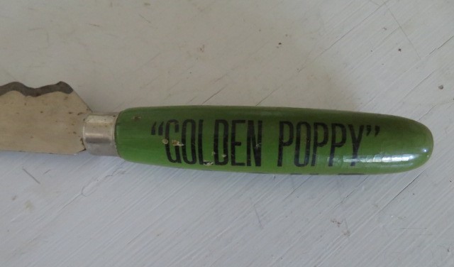 THIS IS A RARE OLD SERRATED BREAD KNIFE WITH A GREEN WOOD HANDLE AND ADVERTISING FOR GOLDEN POLLY FLOUR.