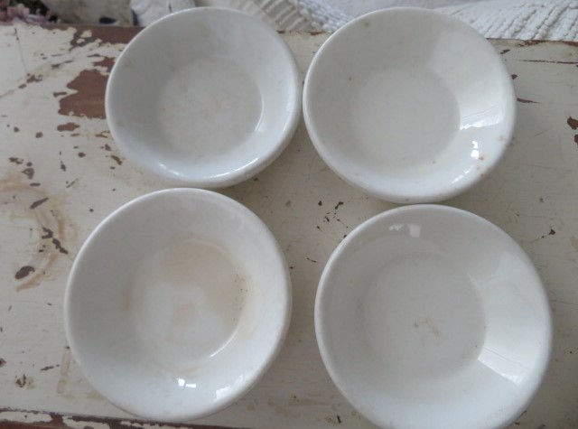 THIS IS A STACK OF FOUR OLD VINTAGE WHITE IRONSTONE DISHES THAT ARE THICK CHUNKY SHALLOW BOWLS THAT HAVE STAINS AND CRAZING.