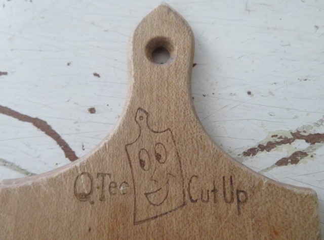 THIS IS AN SMALL PETITE VINTAGE WOOD BREAD BOARD CUTTING BOARD THAT SAYS Q-TEE CUT UP AT THE TOP.