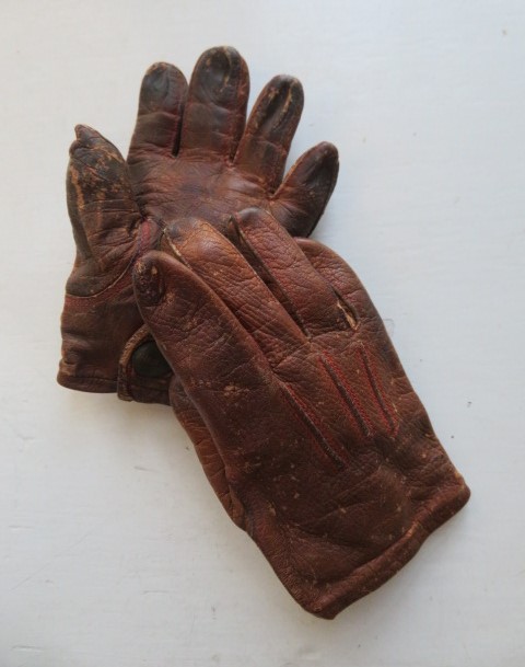 THIS IS A PAIR OF OLD VINTAGE ANTIQUE CHILD'S OR TODDLERS BROWN LEATHER GLOVES WITH SUCH A GREAT LOOK.